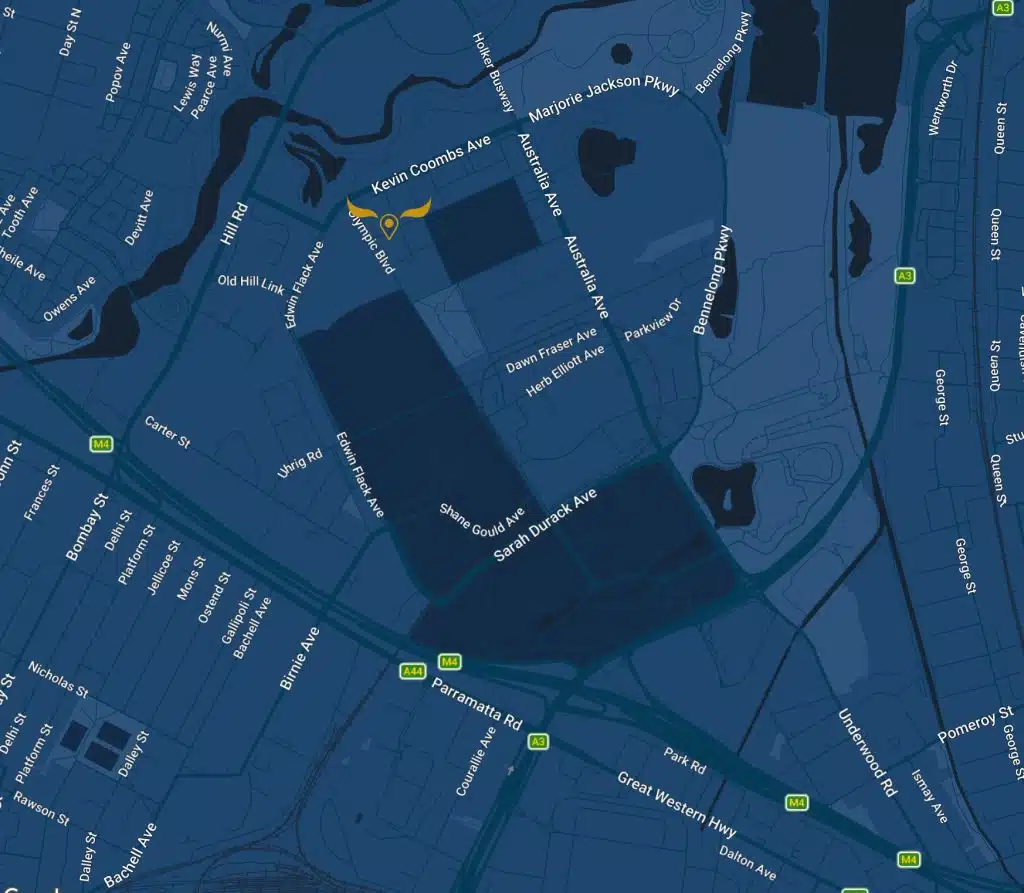 If driving from Northern Sydney, take Victoria Road (A40) to Homebush Bay Drive (A3), then follow Australia Avenue to Olympic Boulevard / Gate 4.